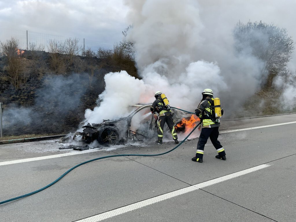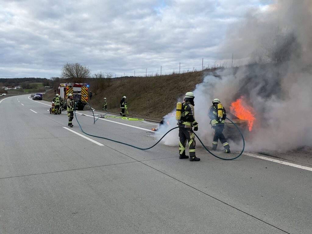 Unter Atemschutz wurde der in Vollbrand stehende PKW sowie der angrenzende Grünstreifen abgelöscht. Für die Dauer der Löscharbeiten wurde die B15n komplett gesperrt.