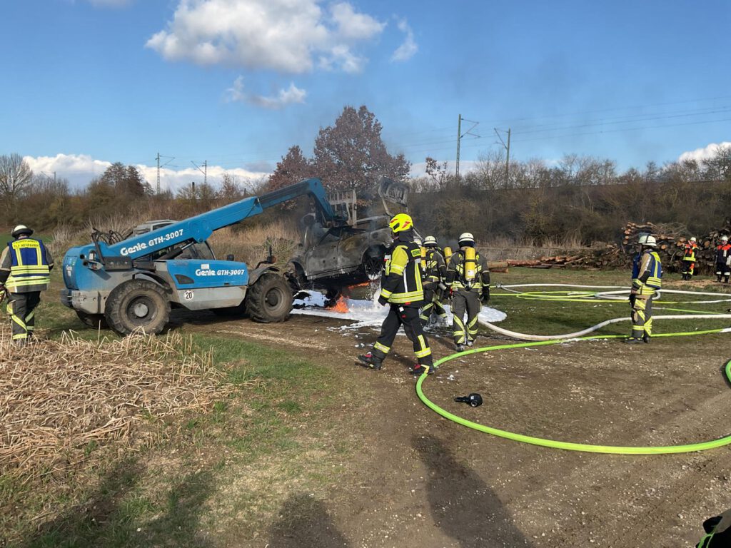 Mit zwei PA Trupps wurde der in Vollbrand stehende PKW – auch mittels Schaum- abgelöscht, anschließend wurde durch einen Kameraden der FF Oberlindhart der PKW kurzerhand mit einem Lader auf die Seite gedreht und auch der Unterboden und Tank abgelöscht.